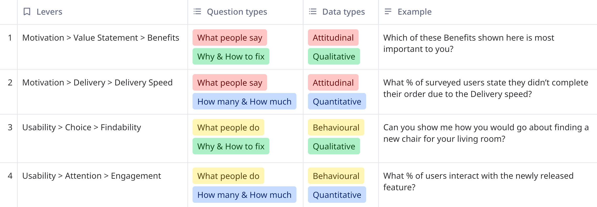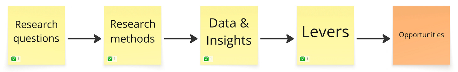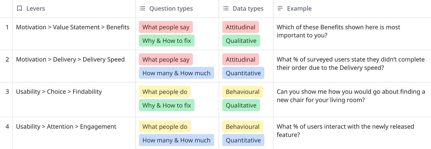 The long term benefit of this is that you’ll start seeing patterns in the UX, which help you form a discovery strategy. These levers also form a great starting point for research questions.
