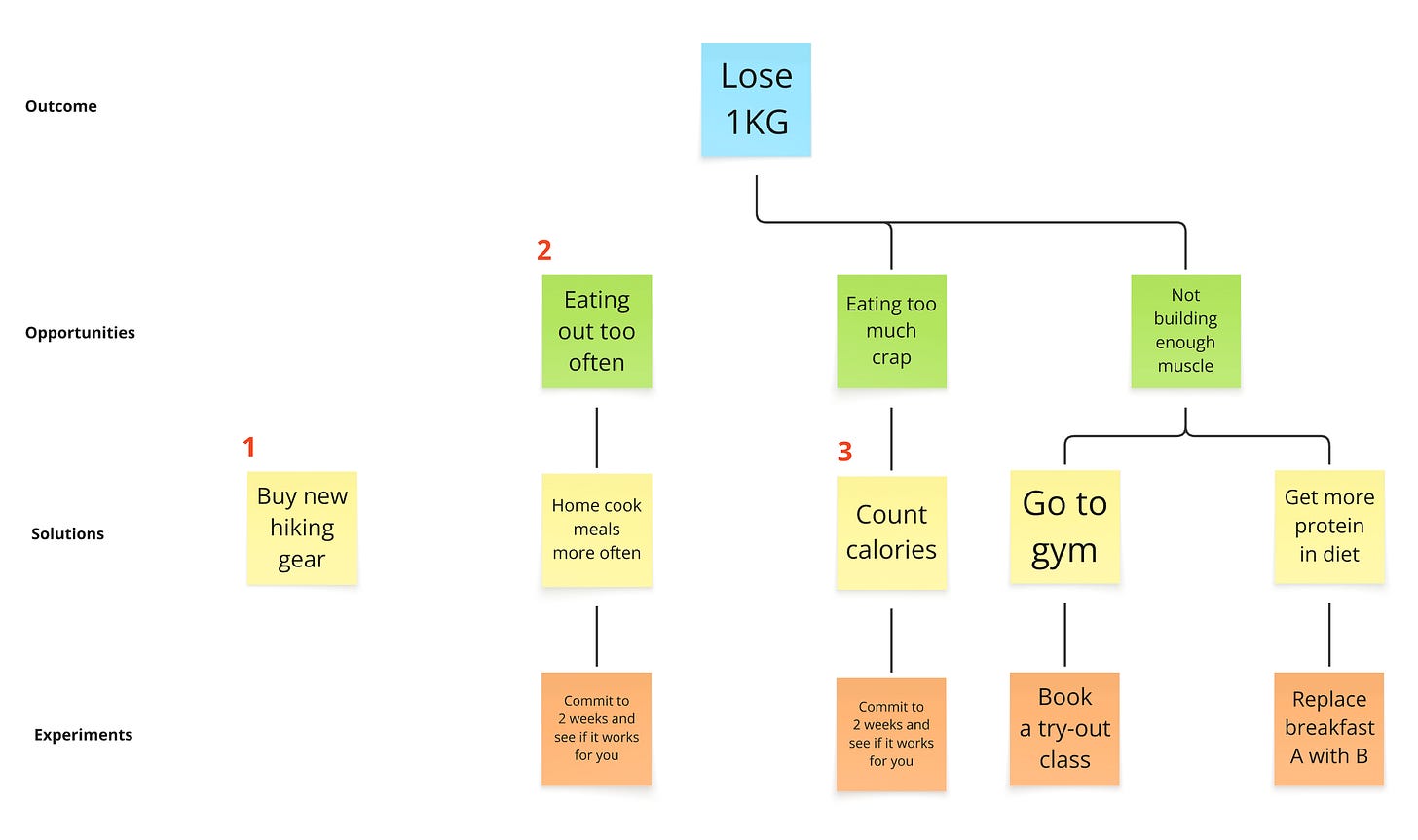 So this happens at least once a week no matter how mature the organisation is. This is the result of idea-first thinking, and always is something that is really cool and shiny, but doesn’t solve a real problem your users have. You can’t tie it to an opportunity in your tree, so chances are small it will really help you drive the outcome. I would love new hiking gear, but sadly it won’t help me lose 1KG. Not really.