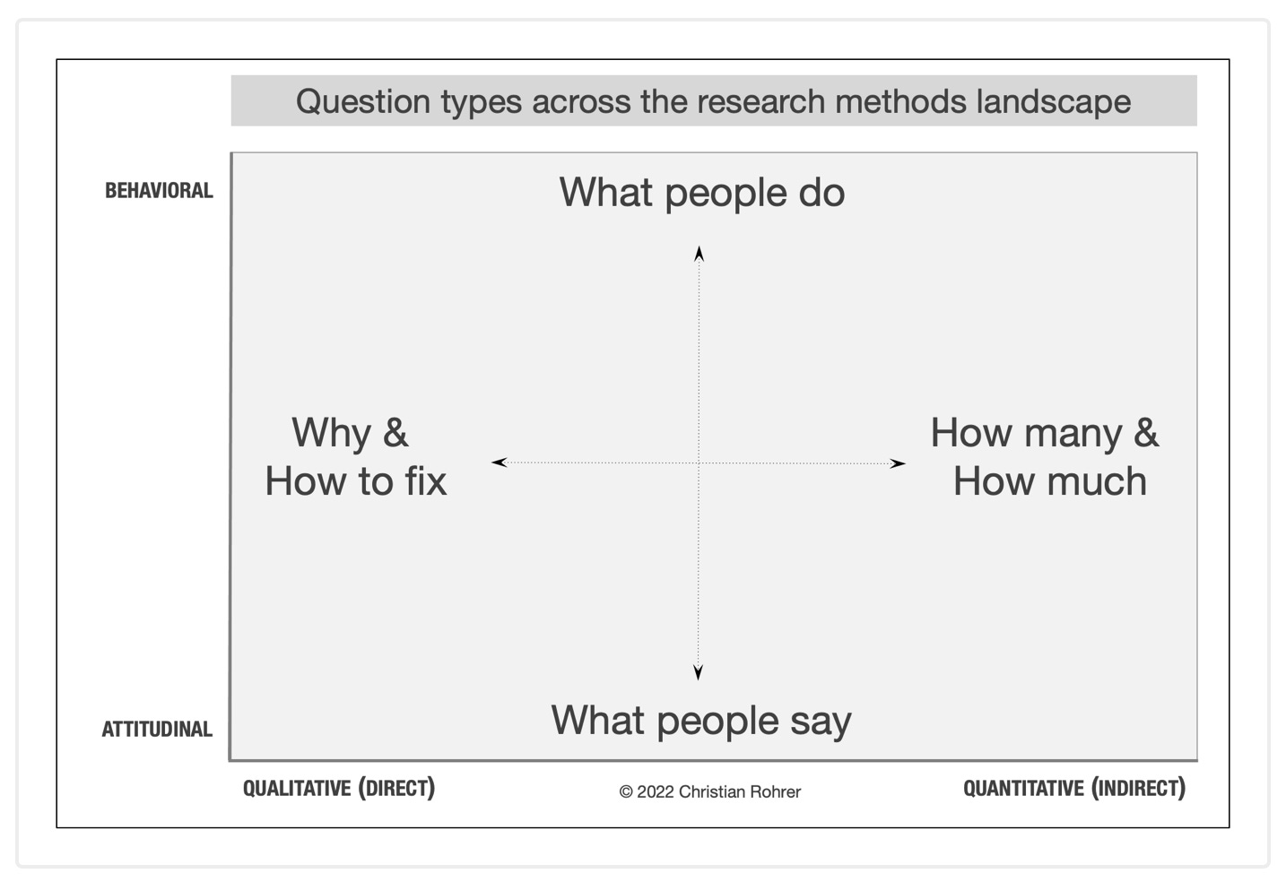 Do you want to be able to ask follow-ups or change direction based on what the user is telling or showing you, so you need to be there in the room to observe it directly as it happens? Then that’s likely a qualitative question. These tend to be the Why? or How do we fix this? kind of questions.