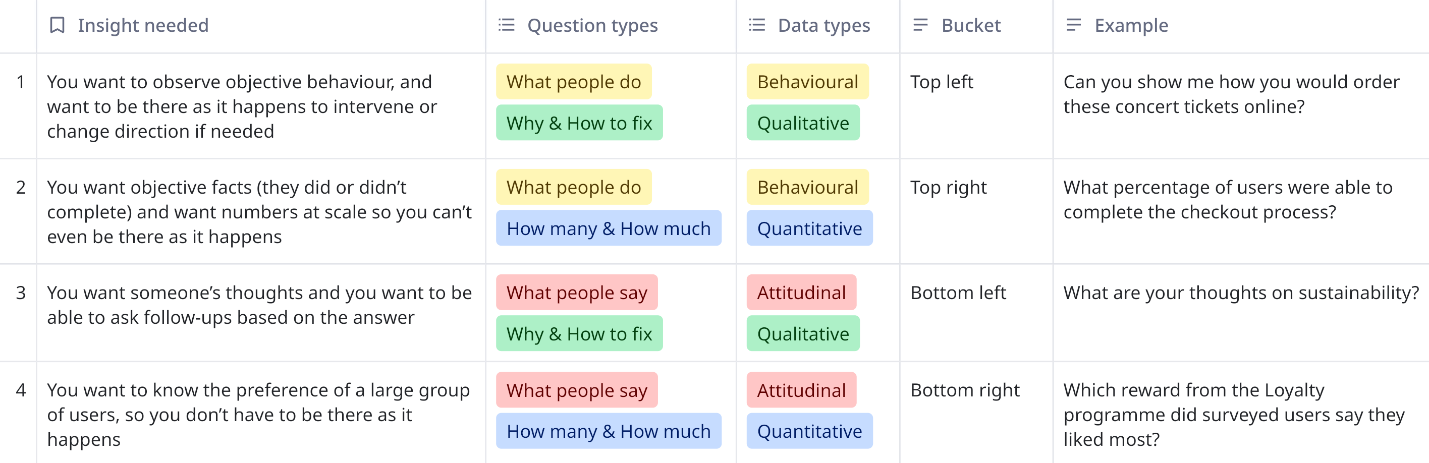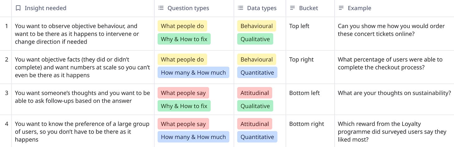 The trick is knowing what question to ask as it sets the whole thing off. Seeing your options categorised in 4 areas helps you with that: are you interested in what people say and do you want to ask follow-ups, or are you interested in what they do and need numbers at scale?