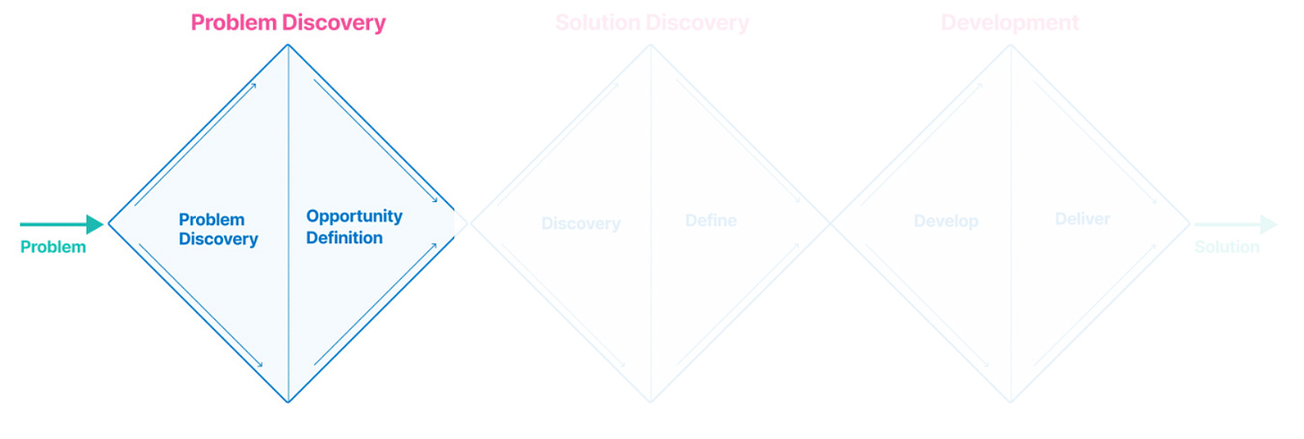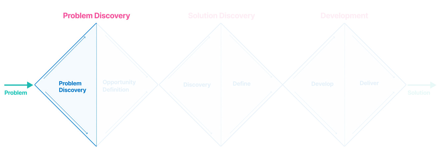 The 1st phase is Problem Discovery. First you find and properly understand the problem (also called Problem Discovery), then you make the problem concrete in Opportunity Definition.