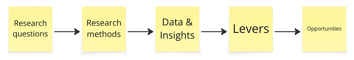 Now that we have basic context, let’s look at the first 3 steps: Research questions, Research methods and Data & Insights.