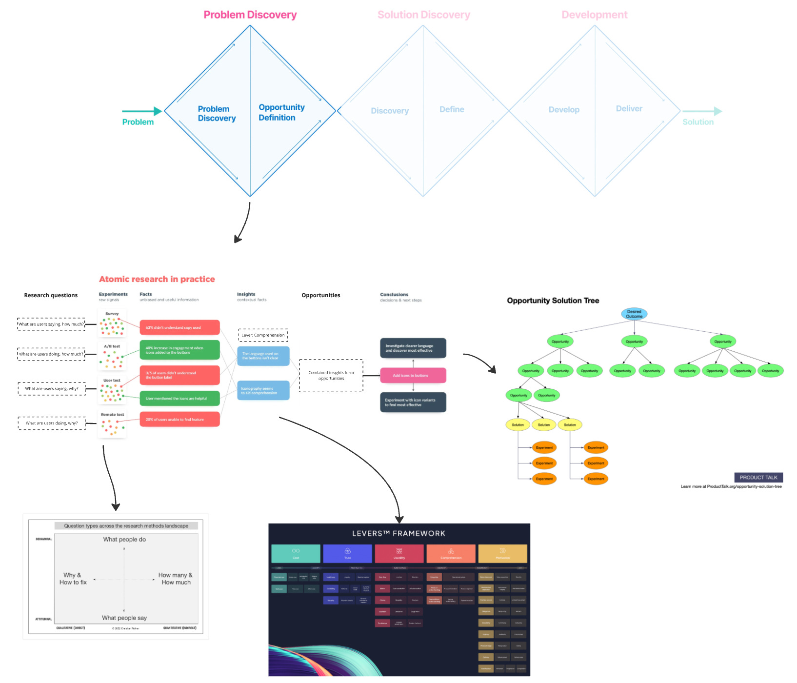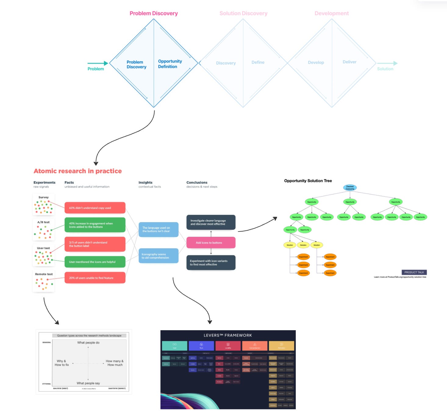 Triple Diamond (bigger picture), Landscape of User Research Methods (better questions), Levers (identify patterns), Atomic Research (strengthen signal), and Opportunity Solution Tree (connect your work)