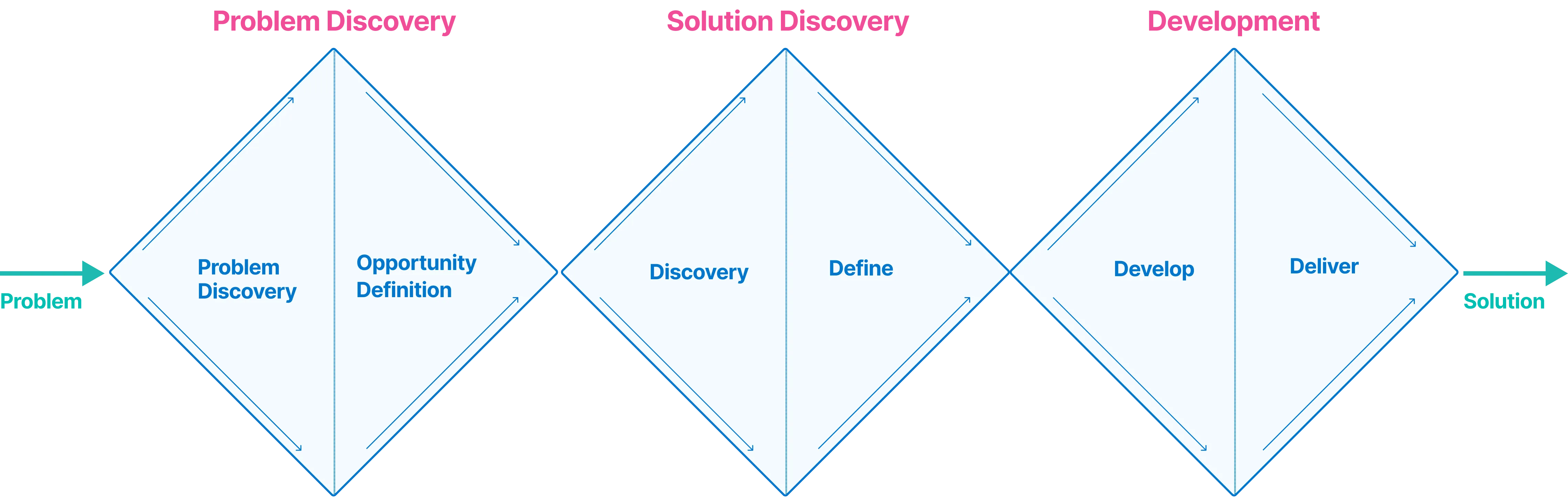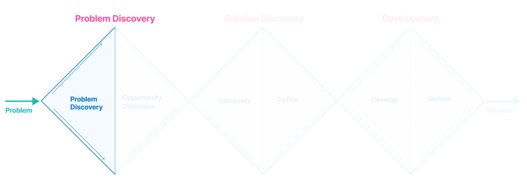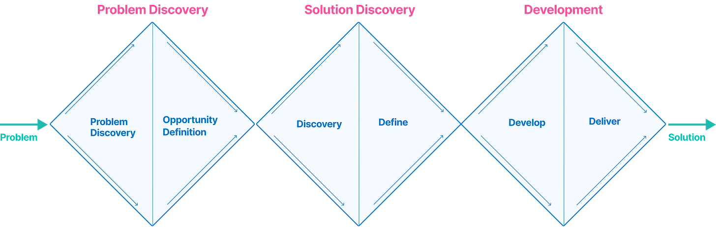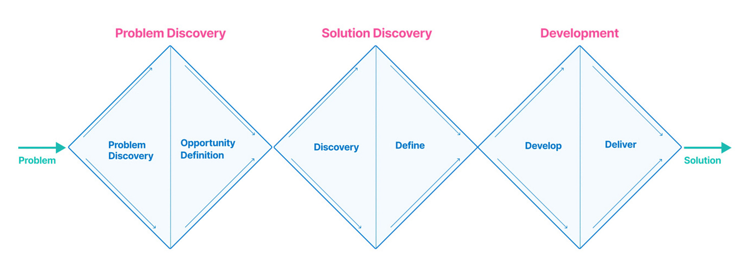 It teaches us there’s a certain sequentiality in which to do things (start with problem, end with solution) and that there’s a point where you’ve done enough discovery and you need to get concrete: the work flows in a diverging to converging cycle (hence the diamonds).