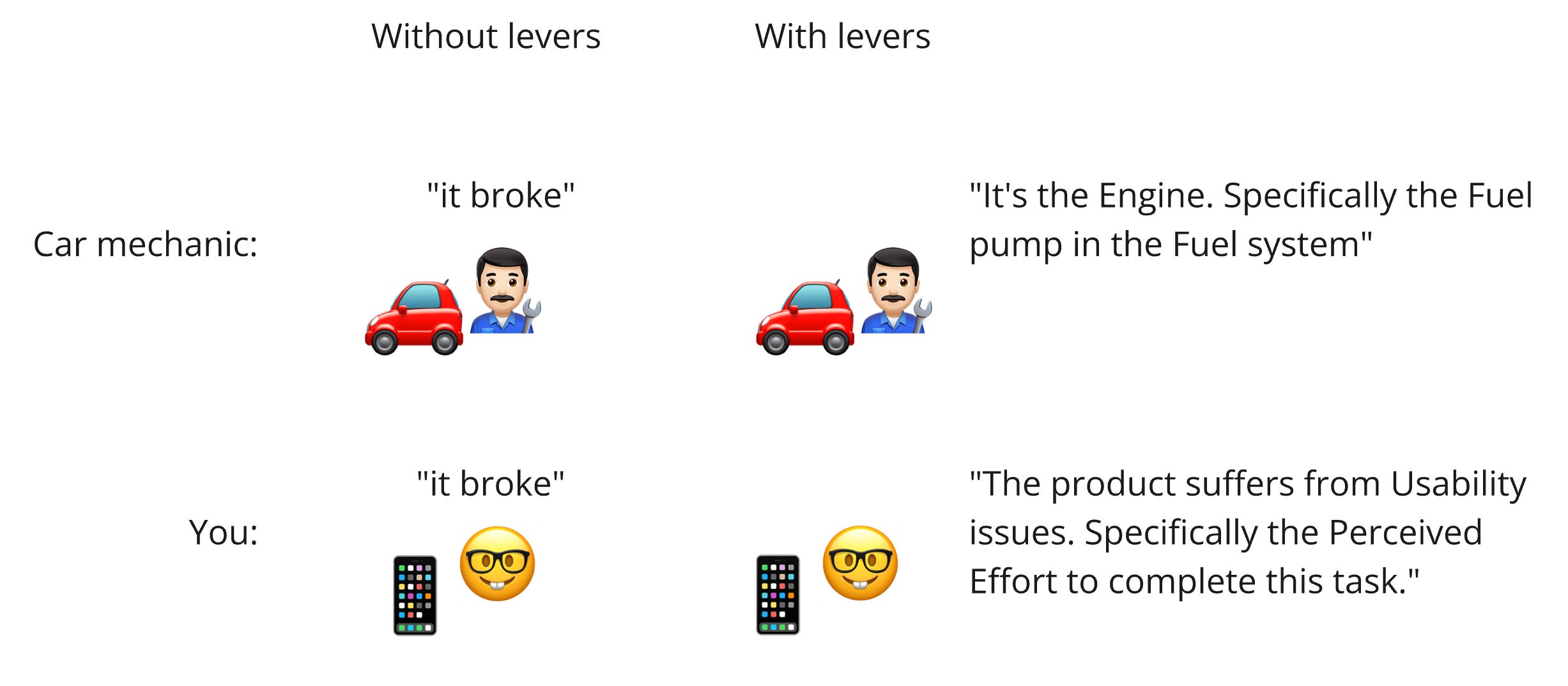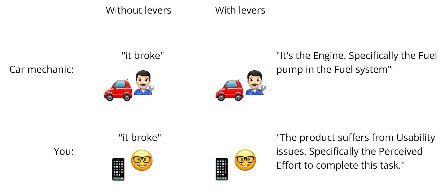 Just like the mechanic who can point to the Fuel pump instead of the entire car as the problem and replace just that part, you can point to a sublever of Usability instead of the app as the problem and focus on just that lever.