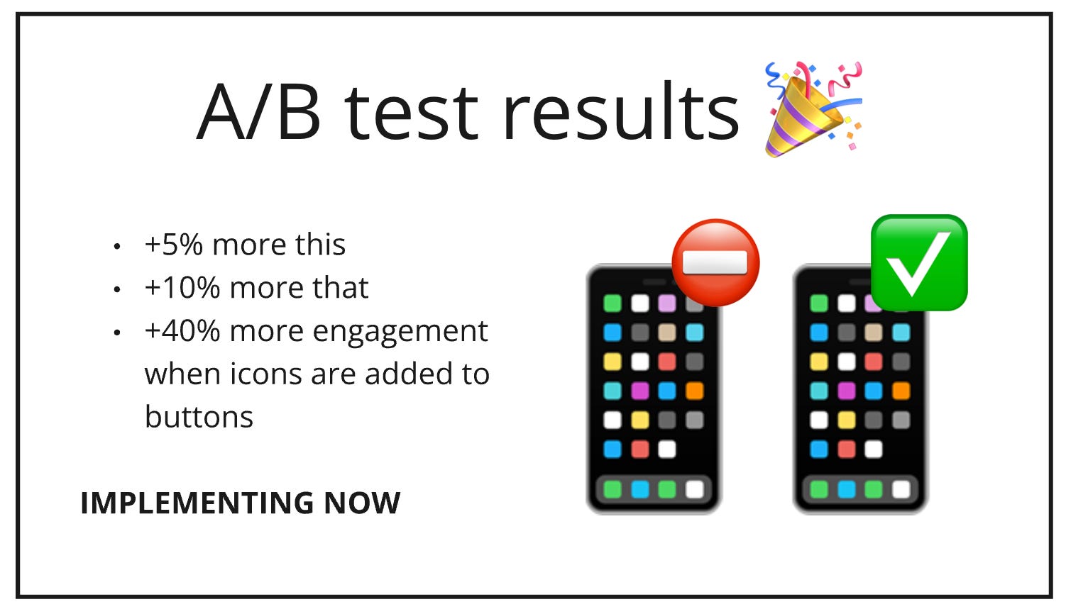 An A/B test was conducted that had a positive impact on all sorts of important goals. It also had a positive impact on engagement: +40% more engagement when icons are added to buttons.